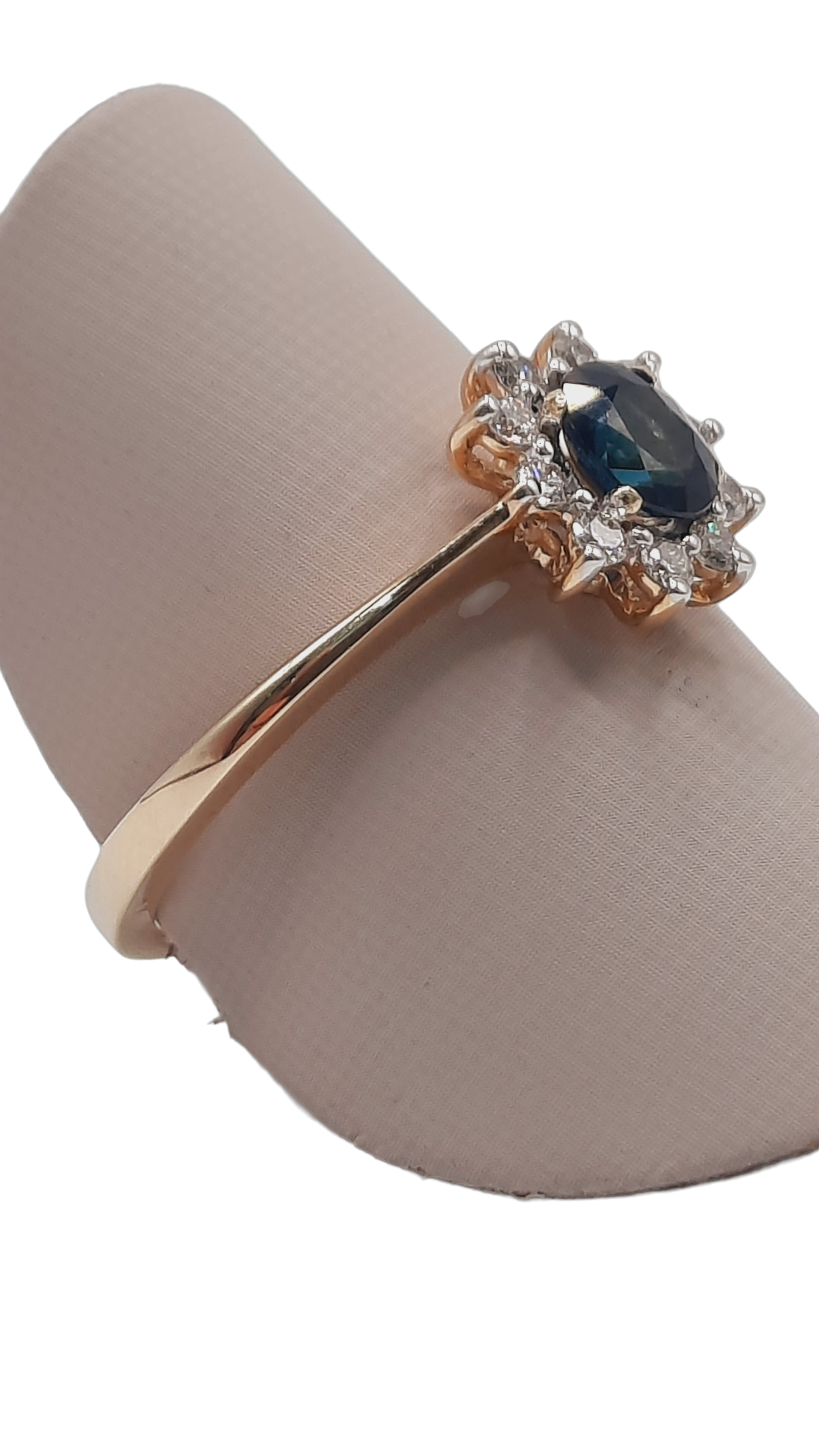 Deze prachtige 14kt gouden ring combineert een schitterende briljante diamant (SI1, kleur H) met een elegante saffier. De ring, met maat 55, straalt verfijning uit en is perfect voor zowel formele als alledaagse gelegenheden. Draag hem solo voor een subtiele glans of combineer met andere sieraden voor extra glamour. Een tijdloos pronkstuk voor uw collectie.
