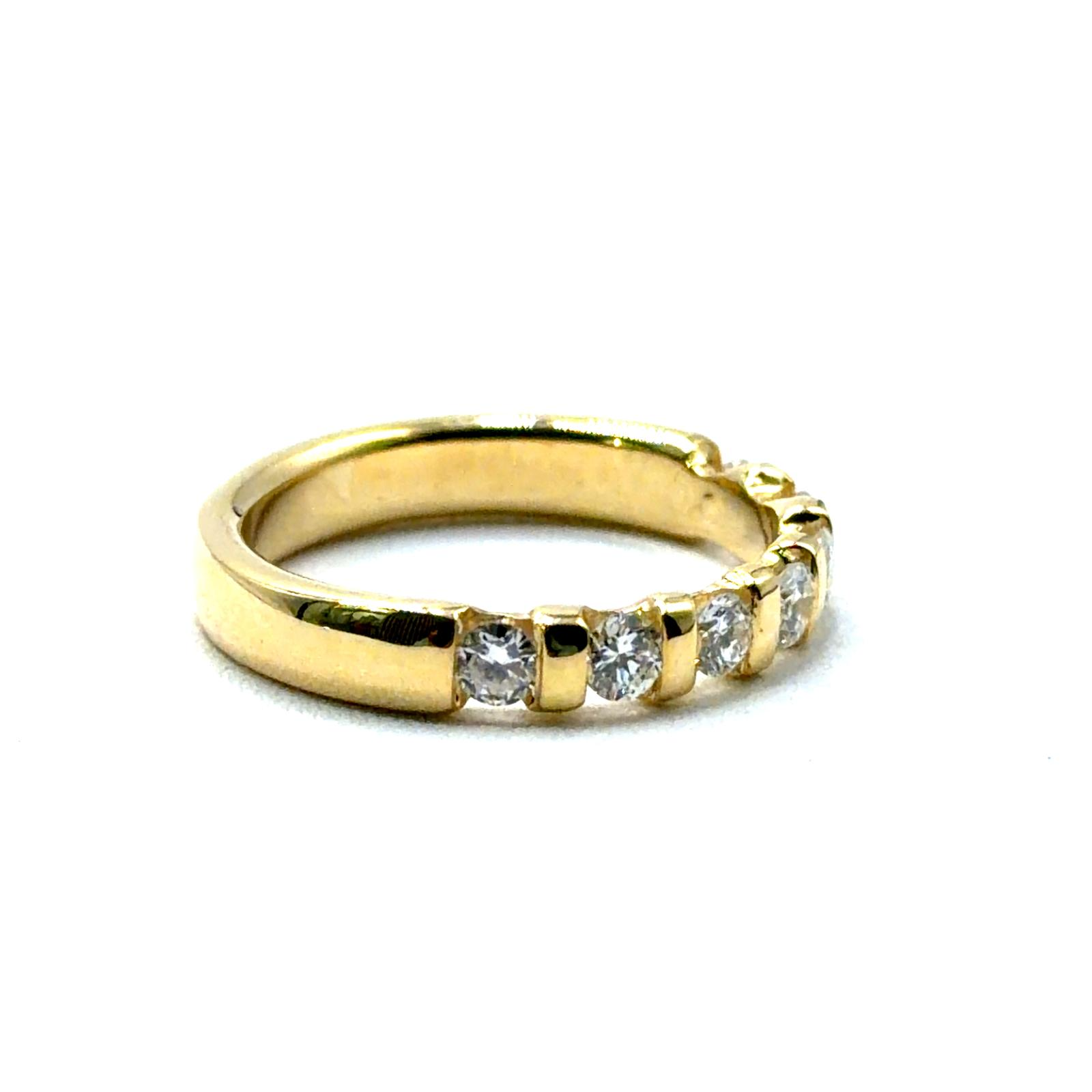 Dit prachtig ontworpen verlovingsring, modelnummer 0064, is vervaardigd uit 14-karaats goud en straalt elegantie uit met zijn goudkleurige uitstraling. De ring is versierd met zeven briljant geslepen diamanten van 0.65 karaat, SI1 zuiverheid en H (White Wesselton) kleur. Draag deze ring als symbool van je eeuwige liefde en toewijding op je verloving. Perfecte maat: 56.